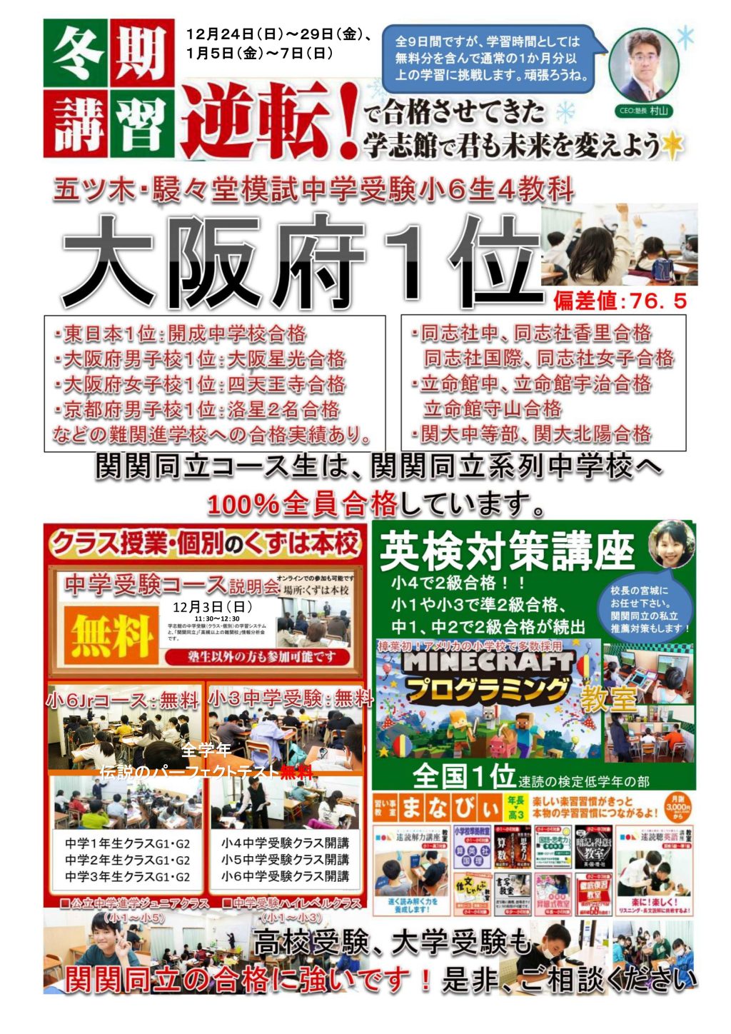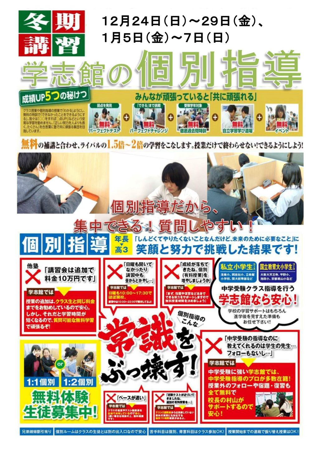 冬期講習:小3中学受験クラス受講料無料!