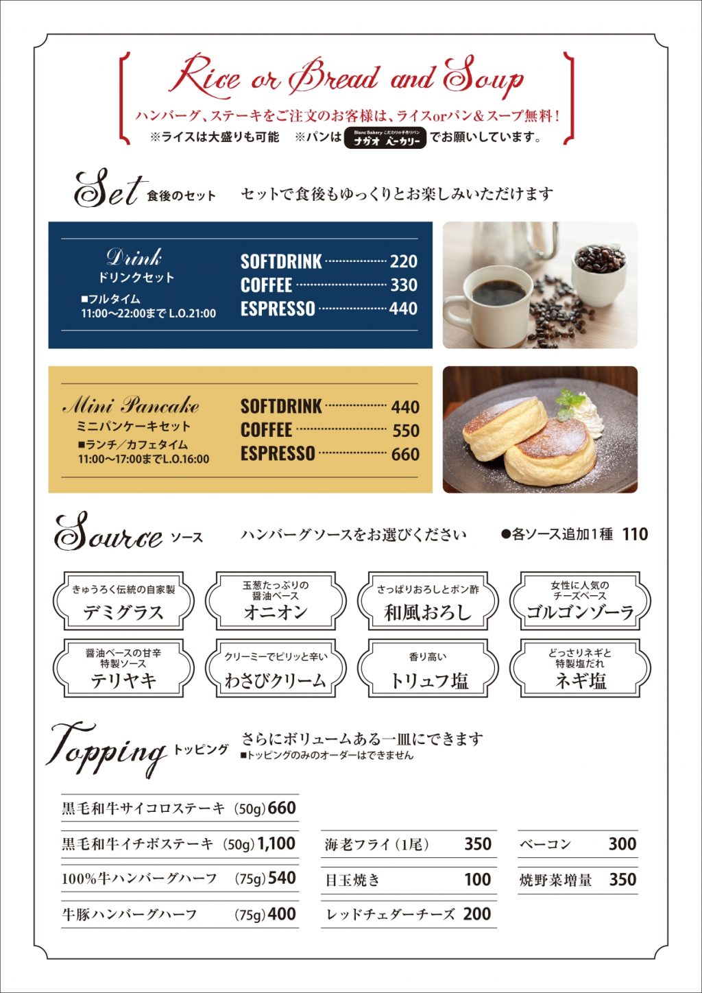 また、ハンバーグランチにミニパンケーキセットをつけると+440円〜ドリンクも付けられます!ゆっくりデザートタイムを楽しめるのが嬉しい♪