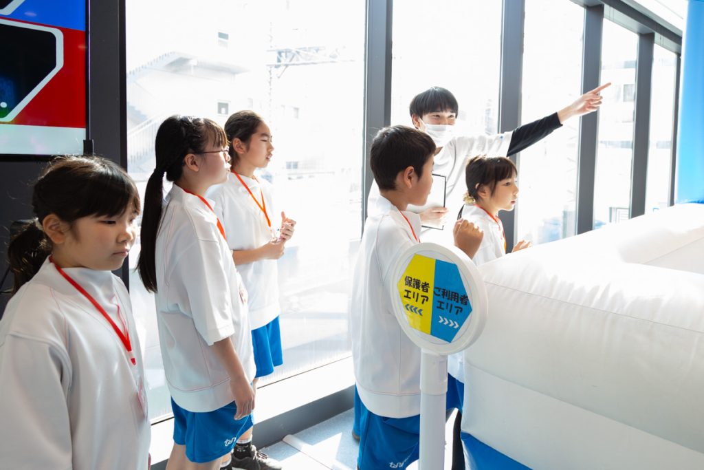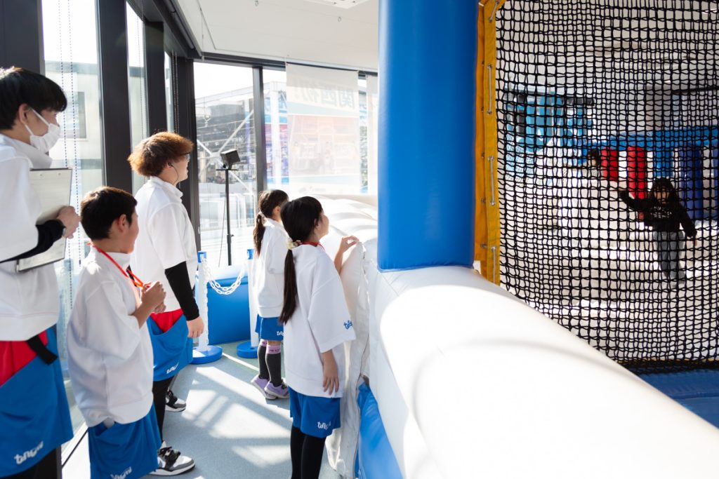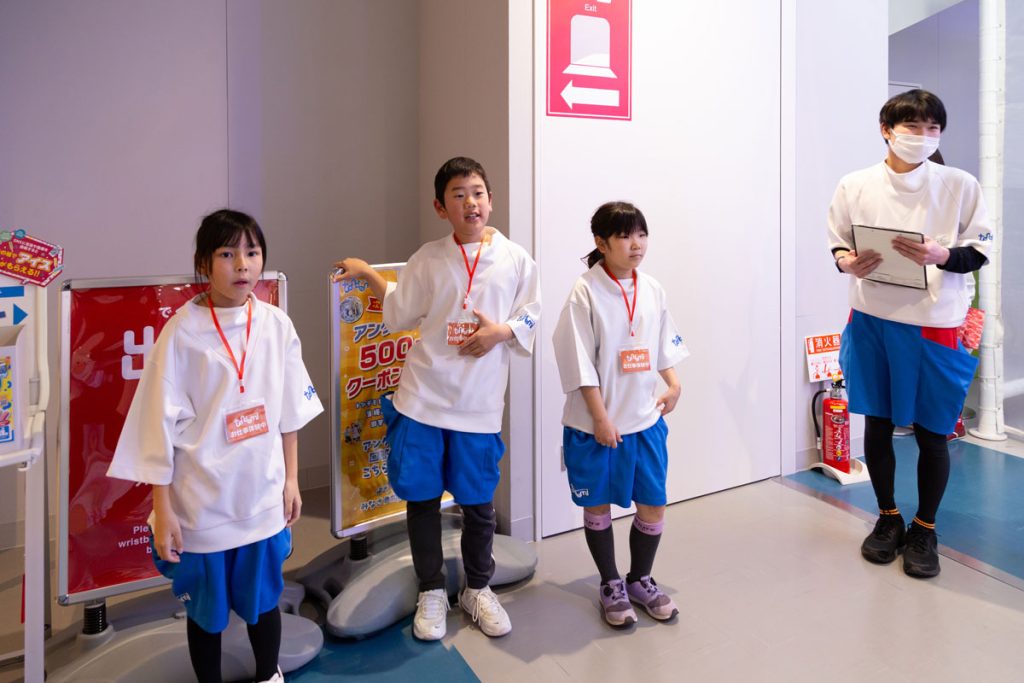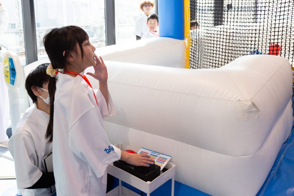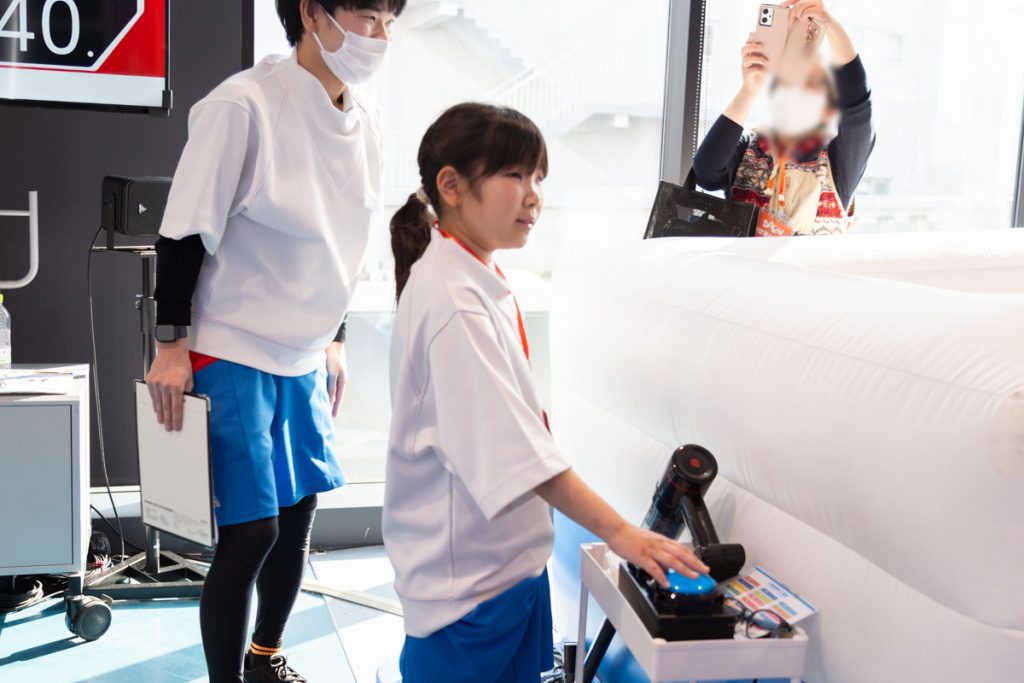 ここではスタートのボタン係と応援係に分かれて体験をします。