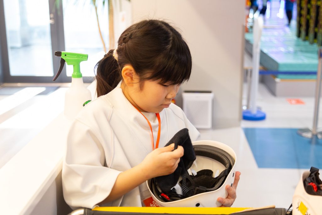 クライミングウォールエリアで使ったヘルメットと安全ベルト(ハーネス)の清掃・消毒です。