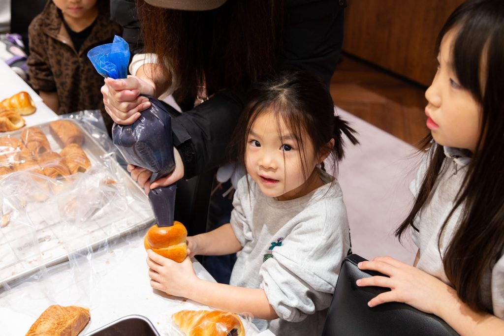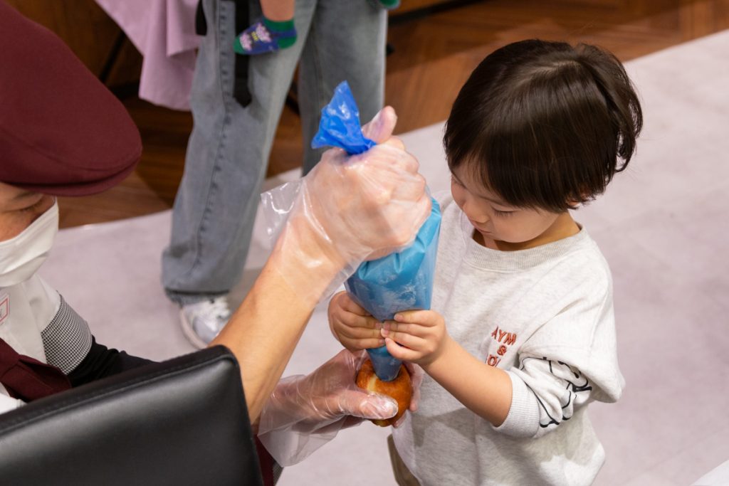 チョココロネ、生ドーナツ、ホイップクリームのデニッシュから好きなパンを選び、職人さんに教えてもらいながらチョコやクリームを絞り入れます。