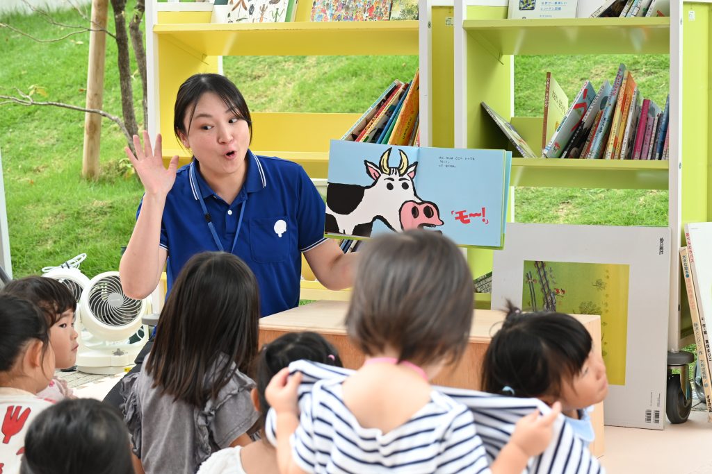青空の下で親子でゆったり本を楽しめる、贅沢な読書タイムです。