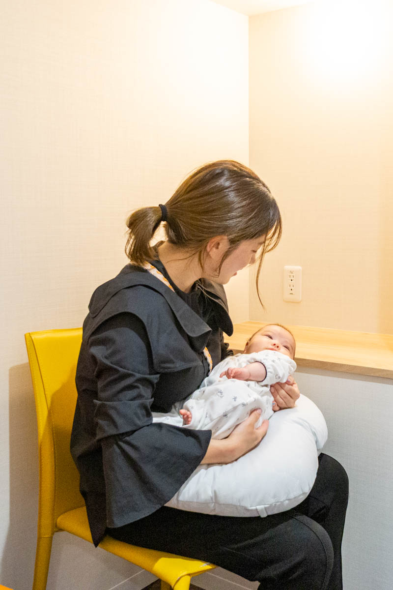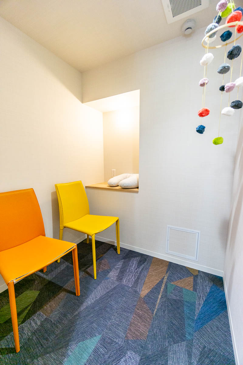 椅子と授乳クッションも用意されていて、扉&鍵付きで落ち着いて授乳できるスペースになっています。