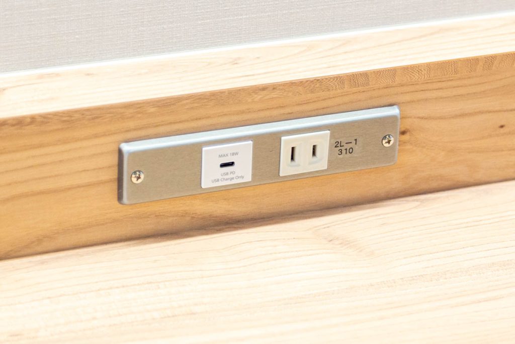 カウンターには電源も完備。通常のコンセントだけではなく、パワーデリバリー(急速充電)に対応できるタイプCもあります。タブレット学習やPC作業をしたいときにも便利!