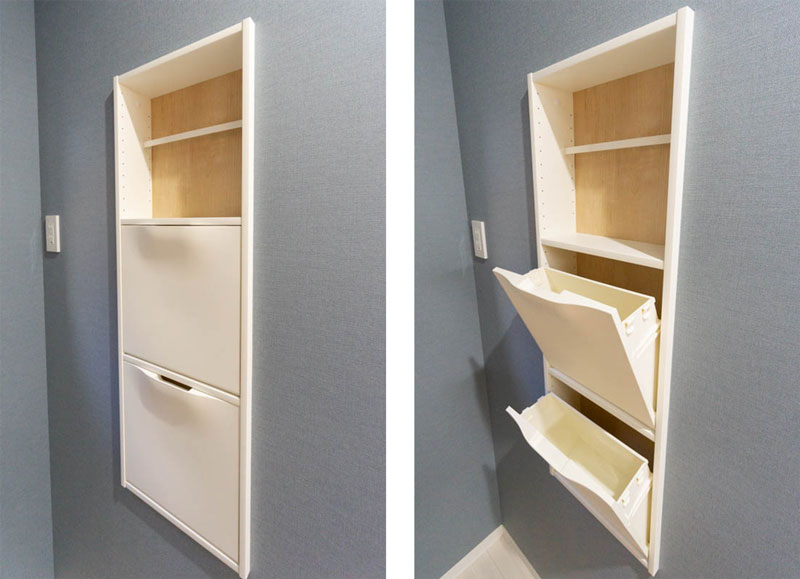 壁には手前開きタイプの棚が埋め込まれています。