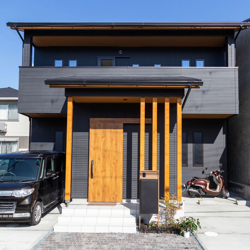 「玄関前には木製のポーチ柱を格子状に配置して、シックな印象にアクセントを与えています」