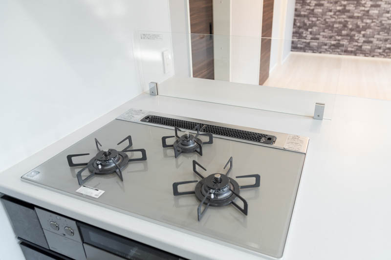 「コンロ前にも壁はなく、背の低いガラス板があるだけなので、開放感を確保しつつ油ハネ対策もなされています」