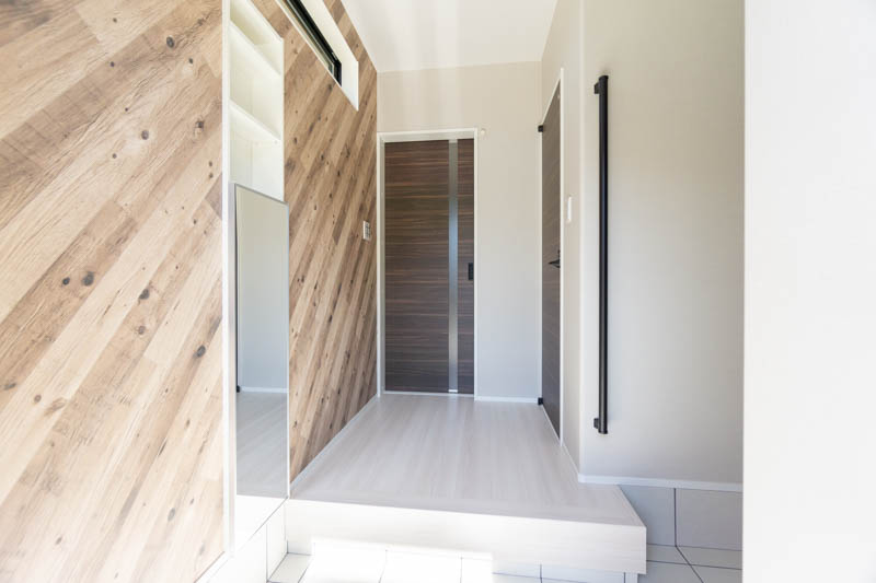 広々とした玄関はナナメの木目調の壁紙がアクセントになっています。