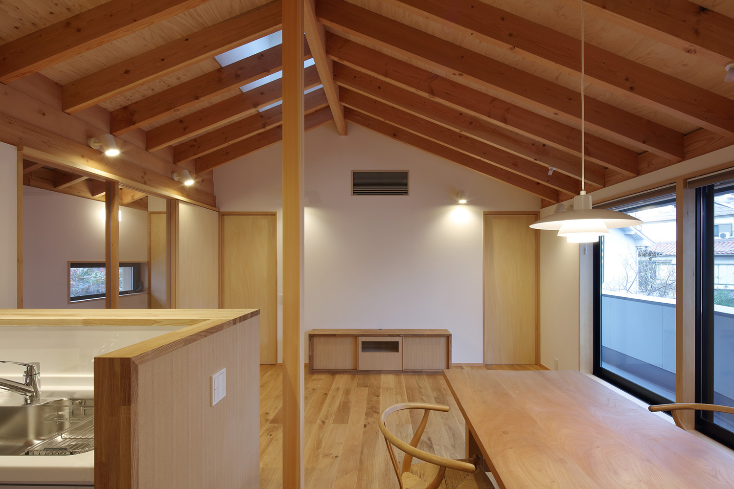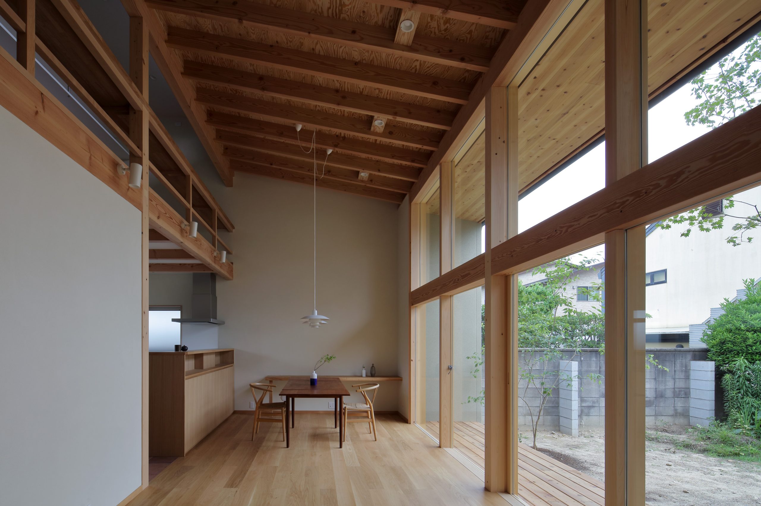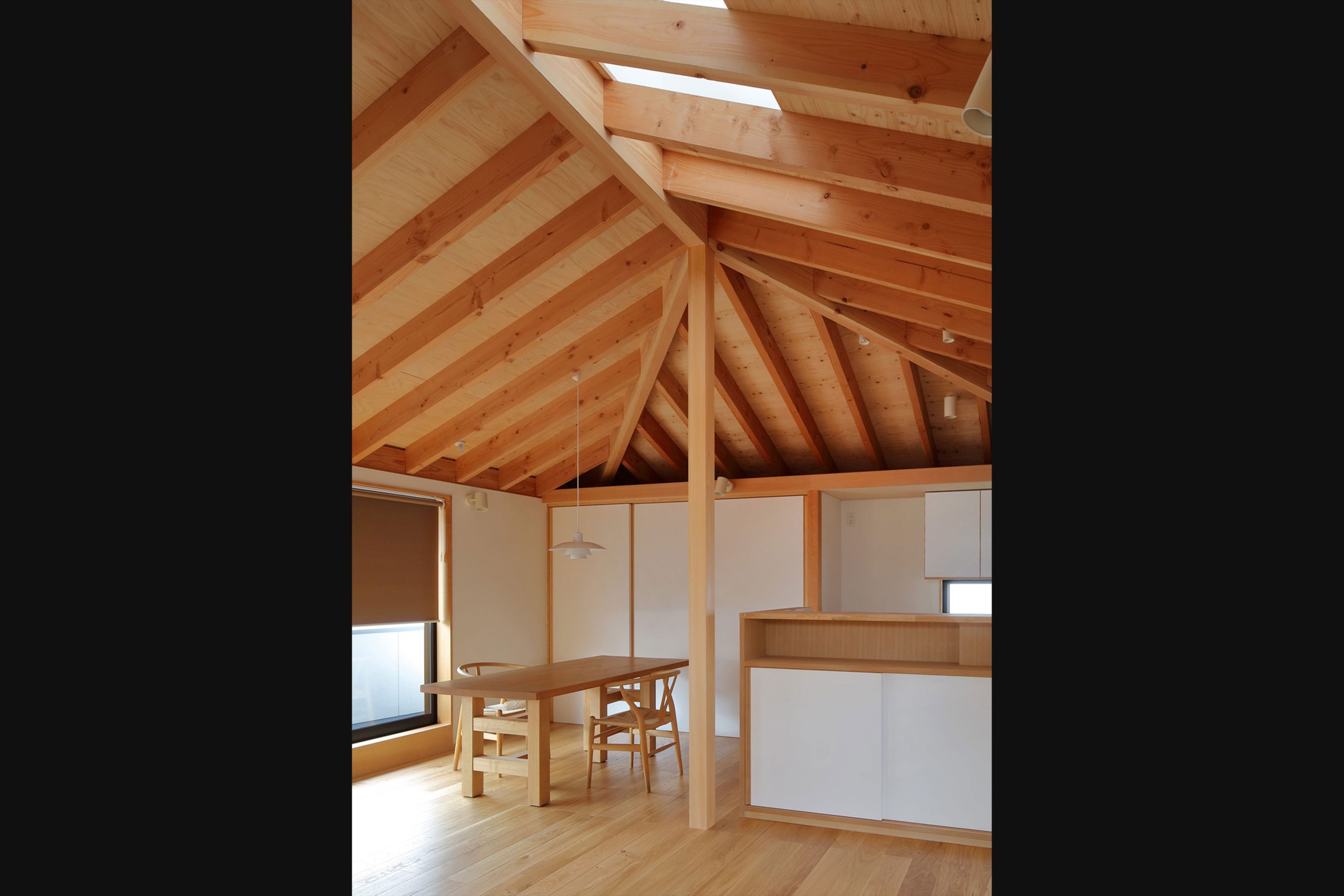 天井は整然と並ぶ屋根の構造材を見せ、屋根のかたちを把握しやすくすることで、空間に面積以上の広がりを与えています。