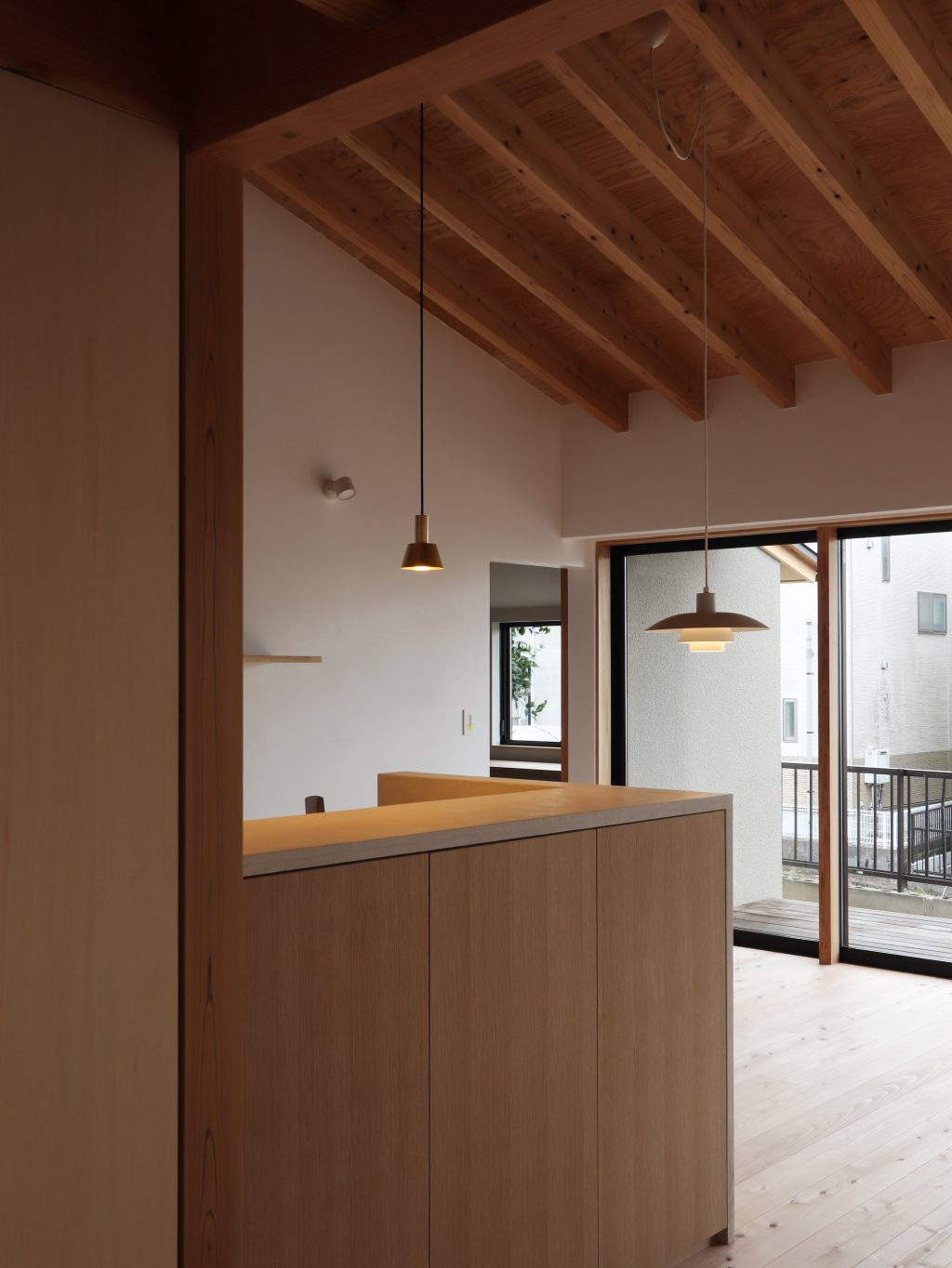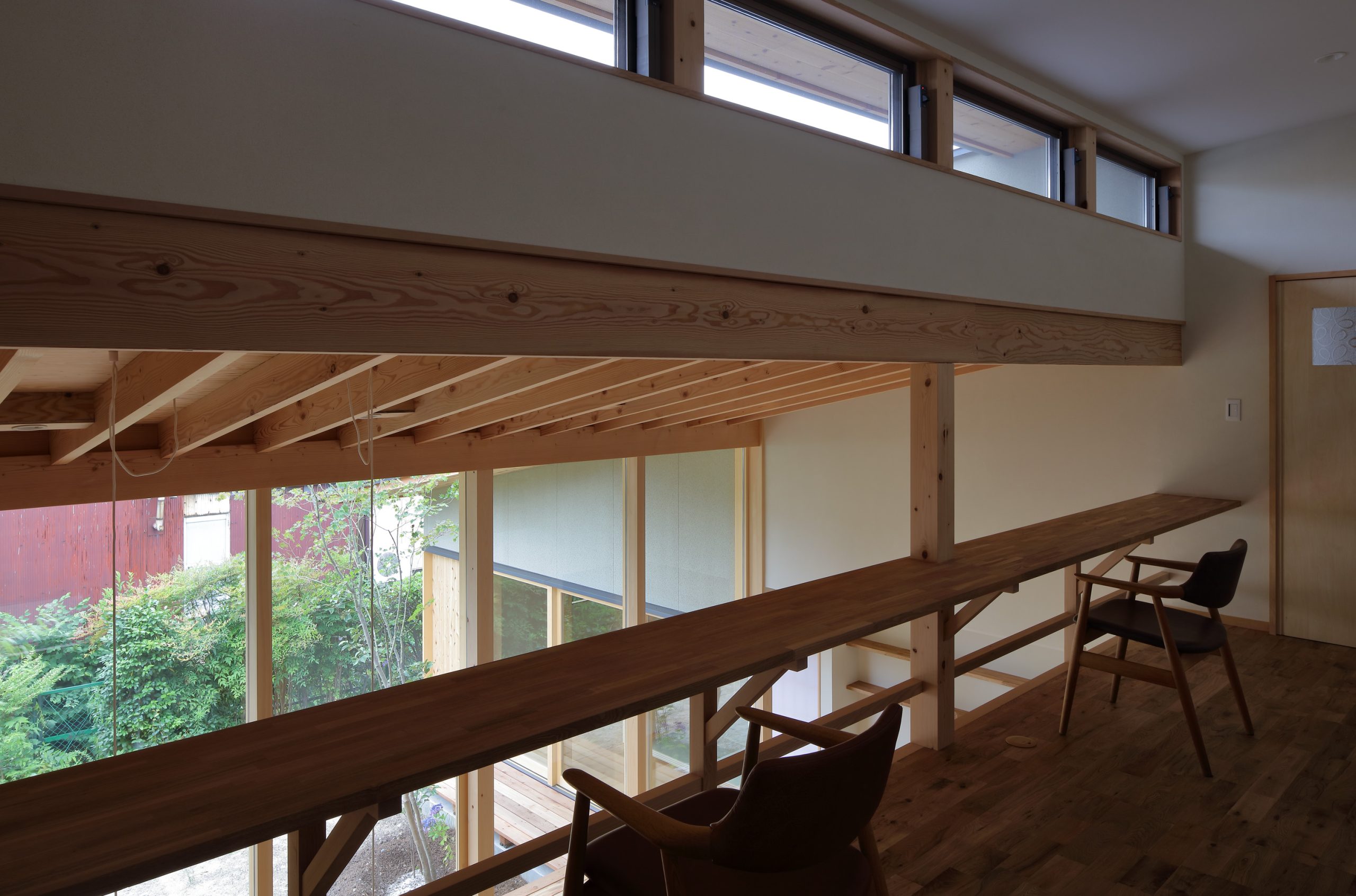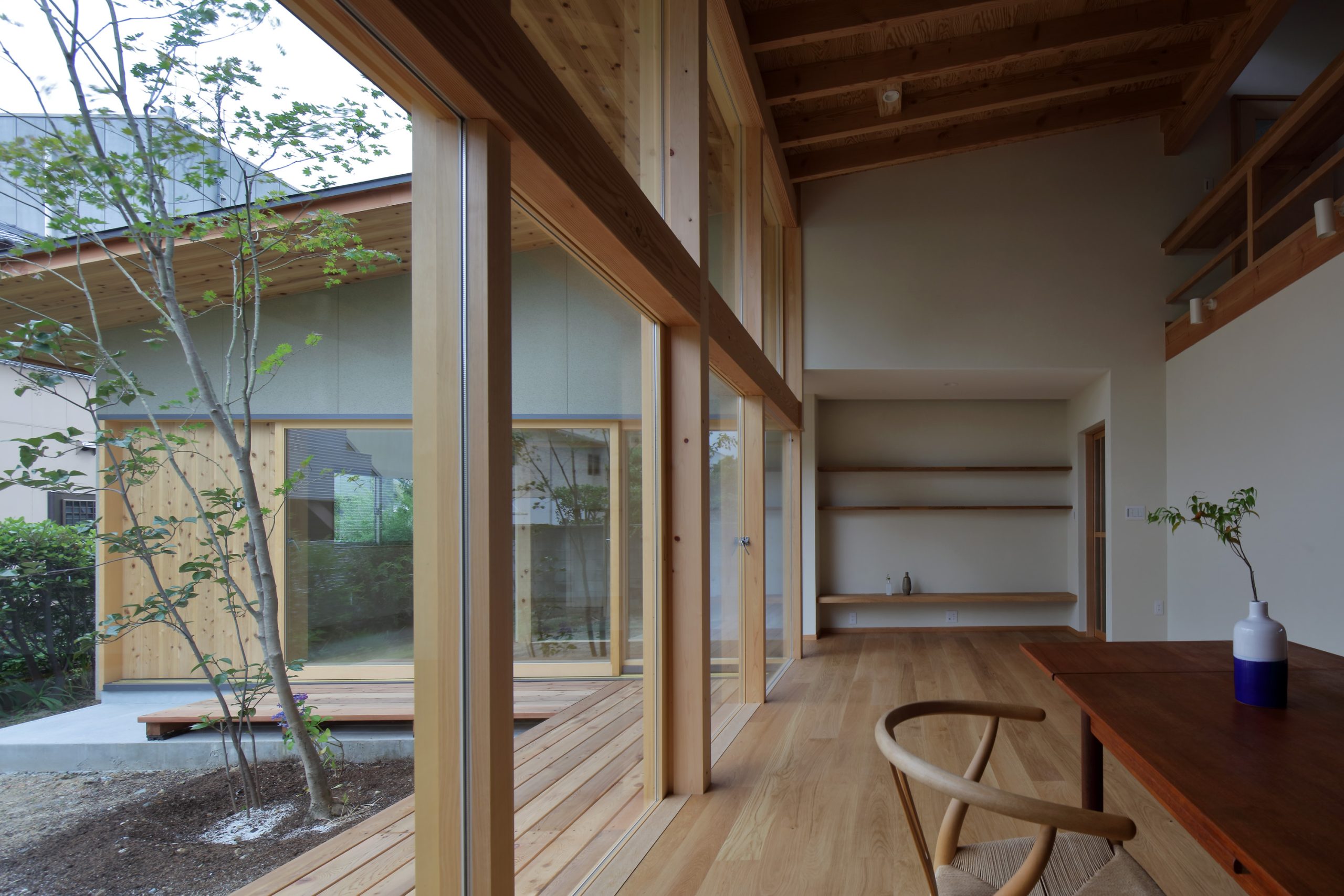 天井は整然と並ぶ屋根の構造材を見せ、屋根のかたちを把握しやすくすることで、空間に面積以上の広がりを与えています。