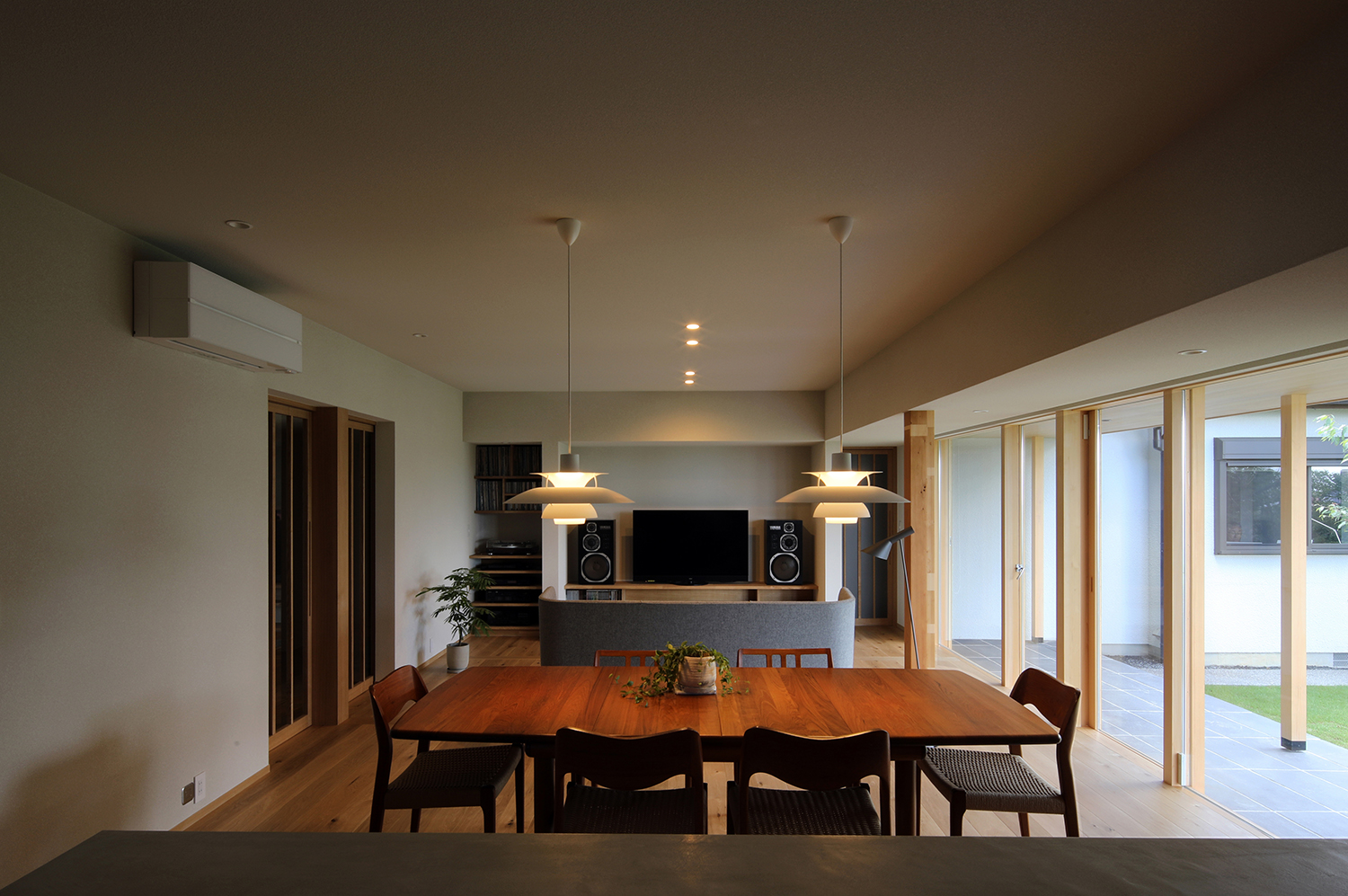 一つの大きな屋根の下に包まれる落ち着いた抱擁感、空間が水平に広がりつながる透明感、大地に近く、重心の低い安定感のある佇まいなど、平屋らしい空間の心地よさを楽しめる家になりました。