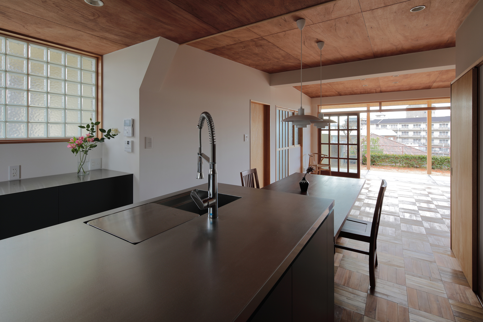 素材の手触りや光の取り込み方、陰影にまでこだわった空間には、住まい手と建築家それぞれの美意識と平屋であるからこその暮らしへの哲学が息づいています。