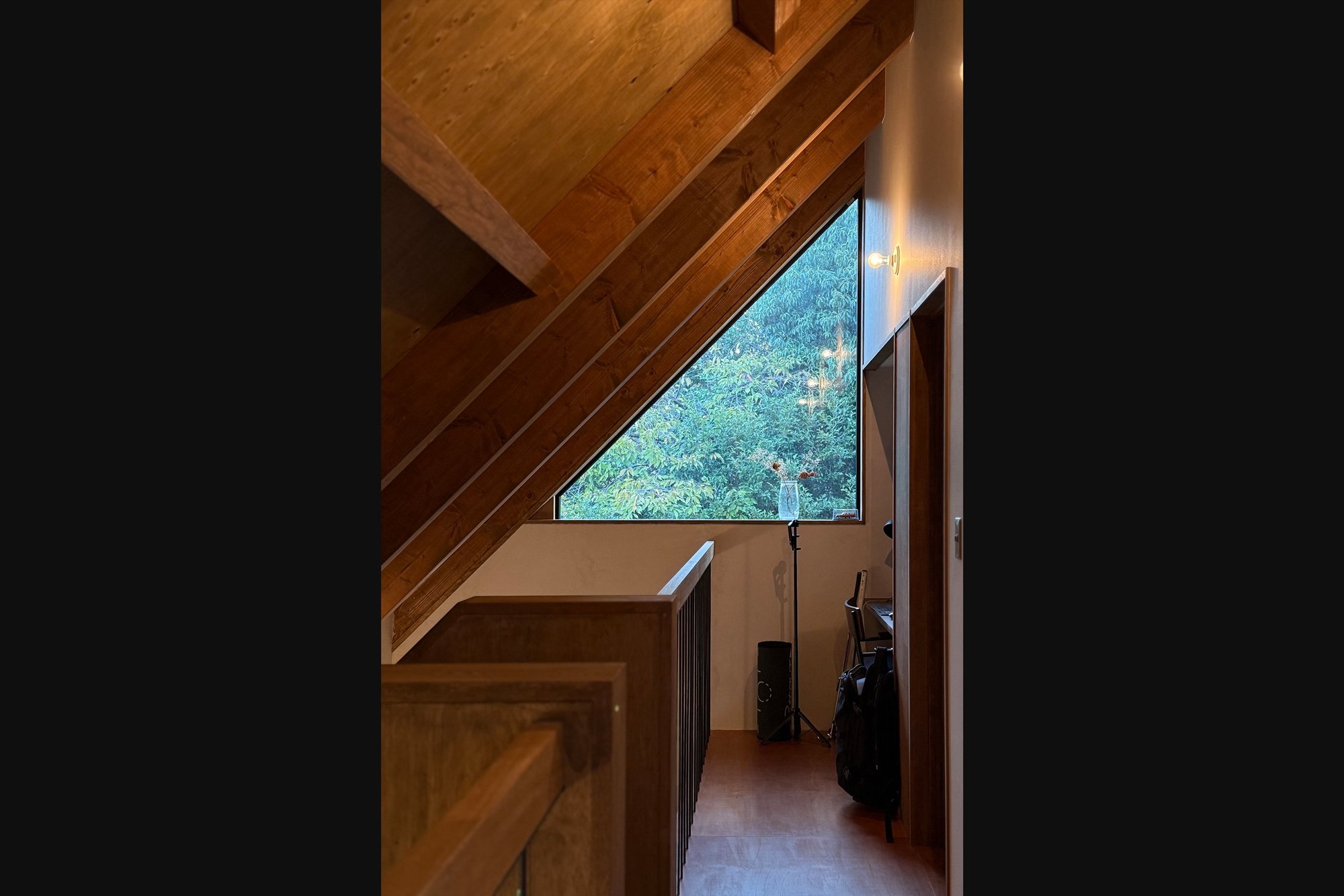 室内は屋根形状を生かした勾配天井が、豊かな広がりと居心地を生んでいます。