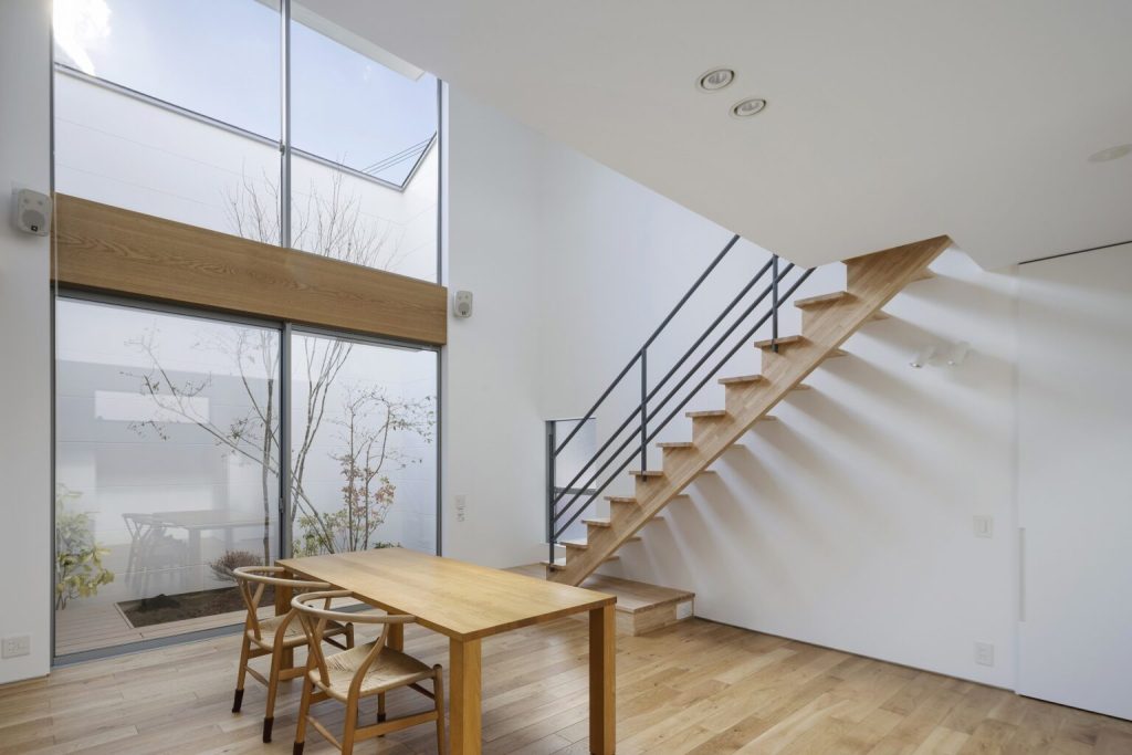 周囲の視線から隠しながら天空から光と風を、中庭から緑を取り込み、1階、2階ともにカーテンに頼らない暮らしを実現しています。