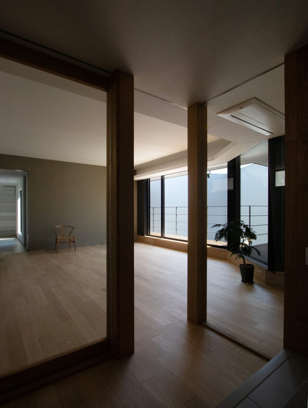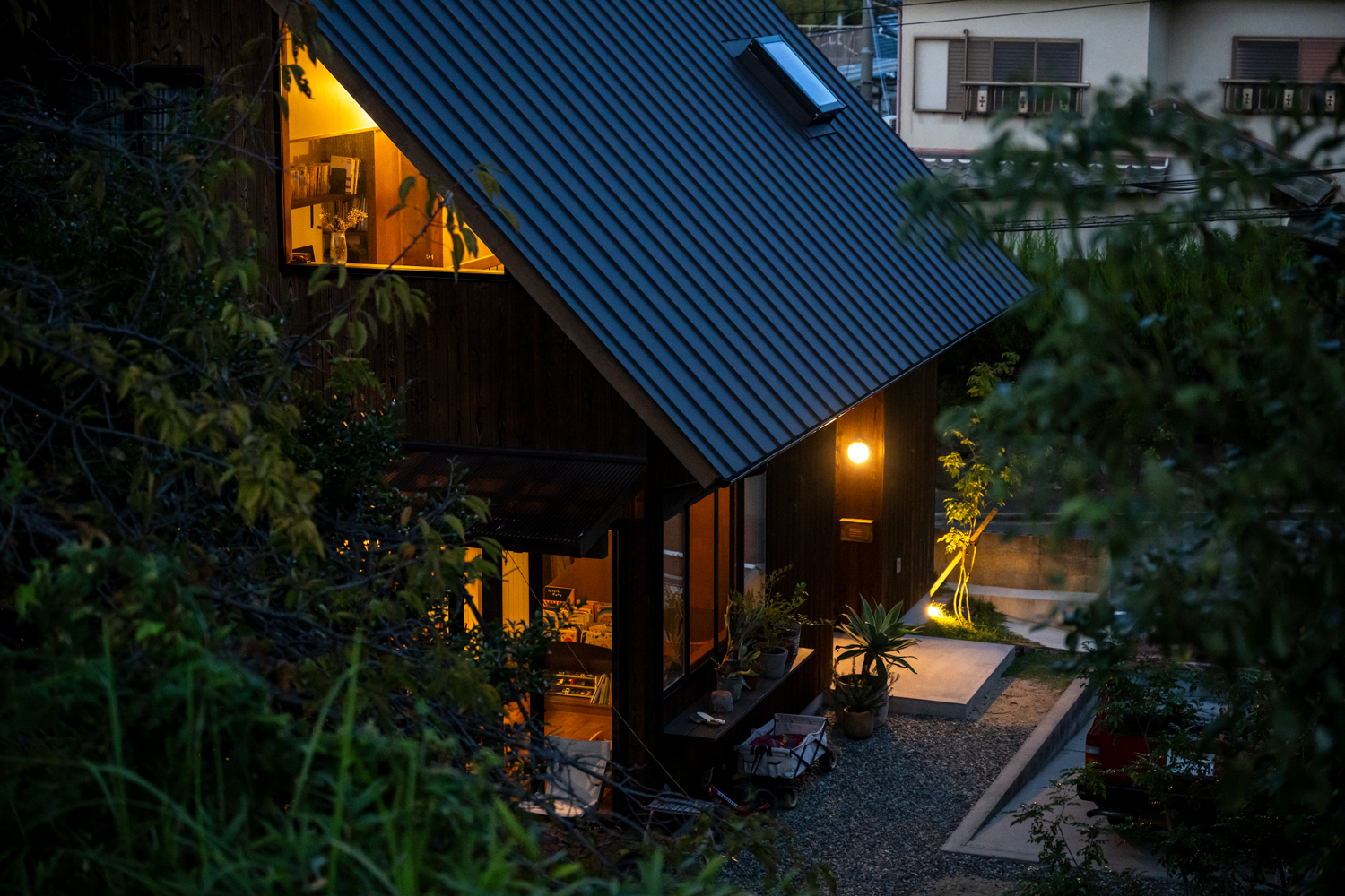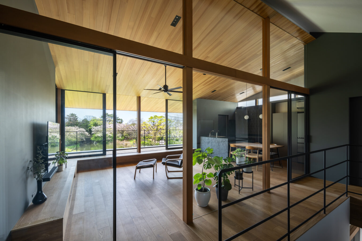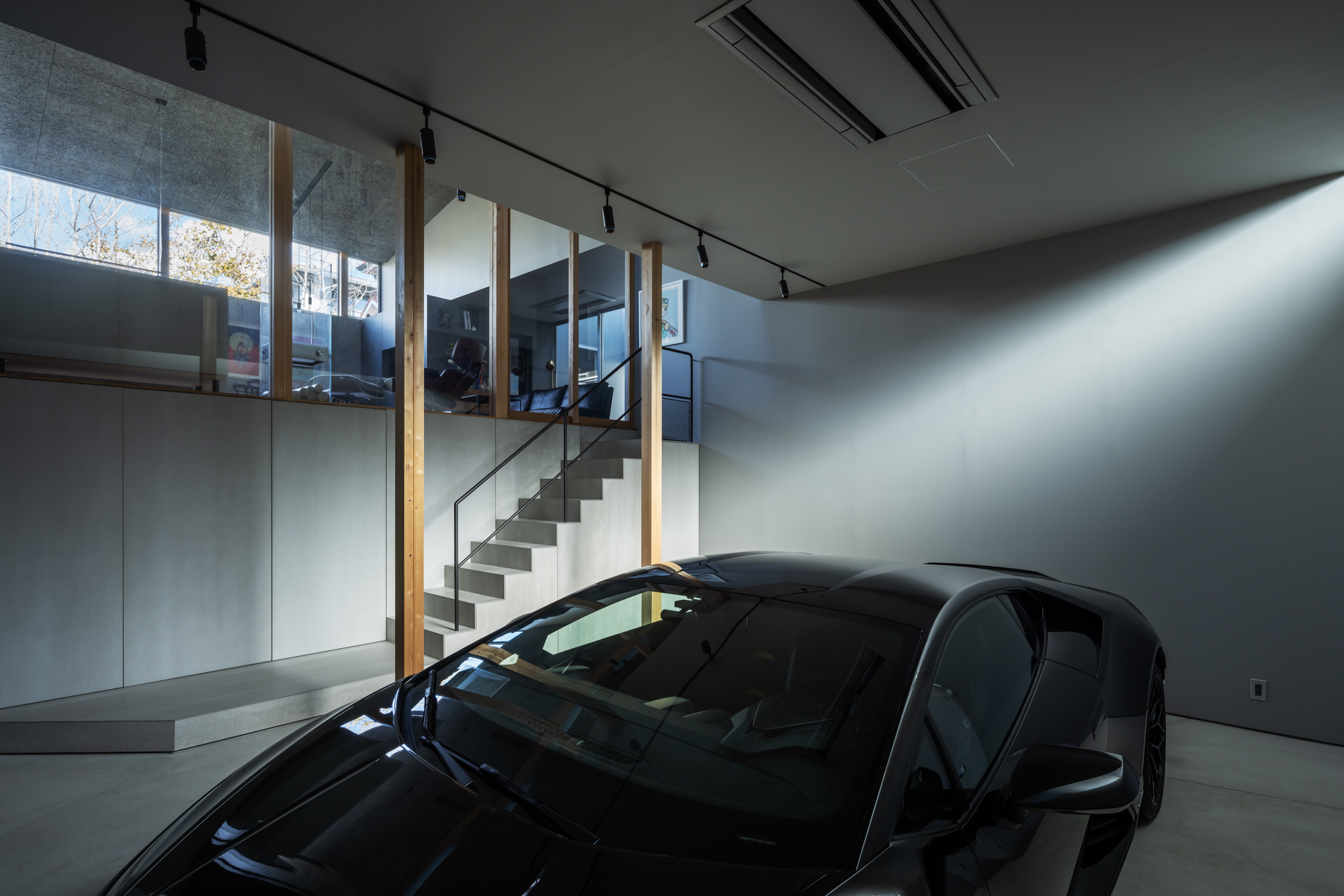 周囲を住宅や高架線路に囲まれた敷地環境で、プライバシーを確保しながら、光や緑を室内に呼び込み、二つの世帯が程よい距離感で過ごせる工夫が散りばめられています。