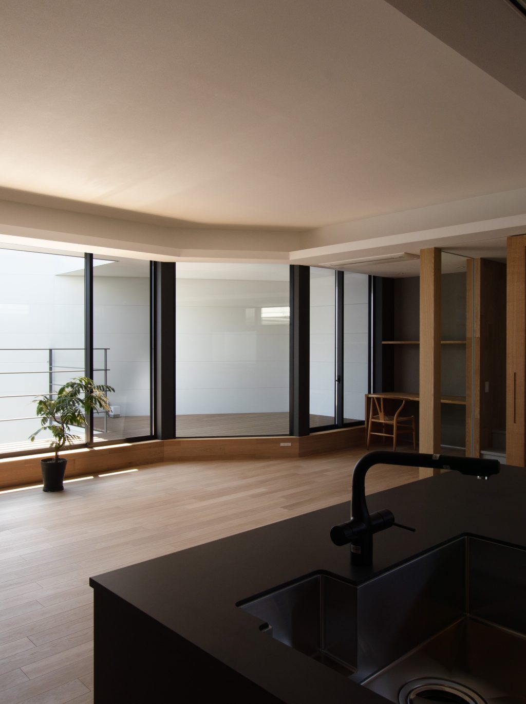 内側に開いた空間構成によって、住宅地にありながら外とつながる心地よさと落ち着きのある空間をご体感いただけます。