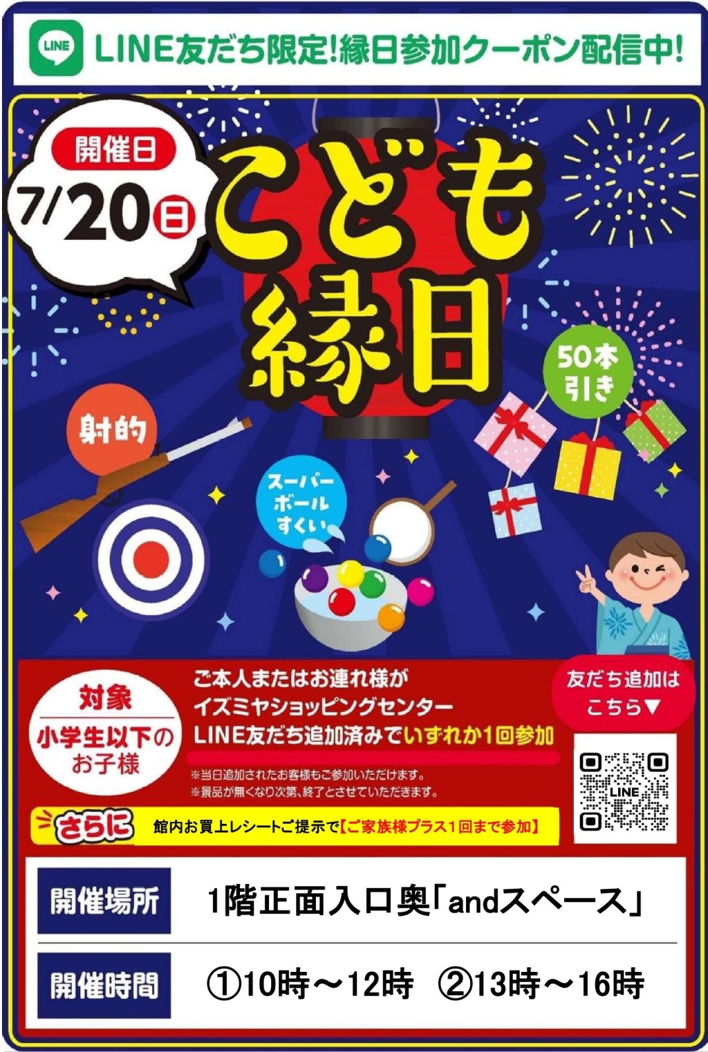 また、7月20日(日)は、小学生以下のお子様対象の縁日を開催します。イズミヤショッピングセンター枚方のLINE友だち追加で1回参加、館内のお買上レシートご提示で、更に1回参加できます。