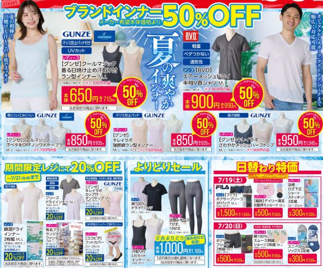 ブランドインナー50%OFFや2点よりどり1,000円、定番商品の期間限定2割引き、日替わりなどなど、夏の肌着がお買い得!!