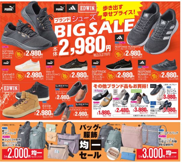 シューズのBIG SALEやバッグ・財布の均一SALEなど、お買い得商品が満載!これぞ幸せプライス!