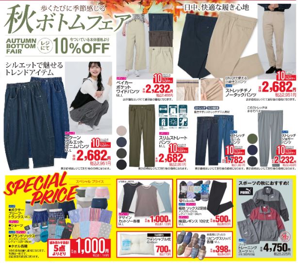 10%OFF、スペシャルプライス商品もある秋のボトムフェアも。1日中快適な履き心地のボトムスをお得にゲットできちゃいます。