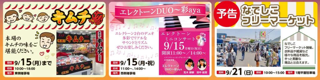 9月15日にはキムチの販売やエレクトーンのミニコンサート、9月21日にはフリーマーケットなど、いろいろなお楽しみイベントも開催されますよ〜。