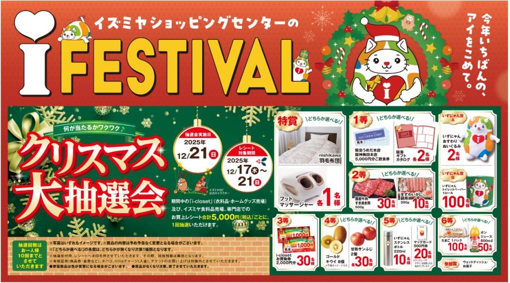 レシート対象期間は2025年12月17日(水)~21日(日)。「i-closet(衣料品、ホームグッズ売場)」及び、イズミヤ食料品売場、専門店でのお買い上げレシート合計5,000円(税込)毎に1回抽選いただけます。