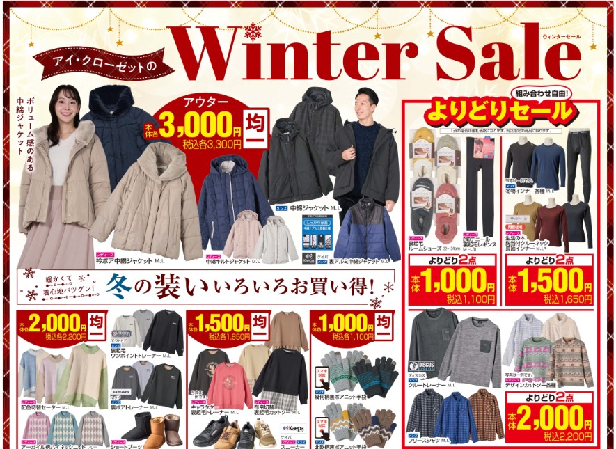 衣料品、ホームグッズ売り場のアイ・クローゼットのウィンターセール!防寒アウター3,000円均一や組み合わせ自由のよりどりセールなど冬の装いがいろいろお買い得!!