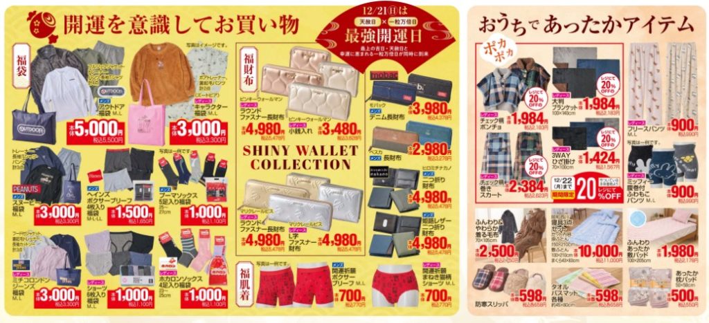 福袋や福財布、福肌着などお正月に向けた商品やお部屋であったかグッズなど盛りだくさん。