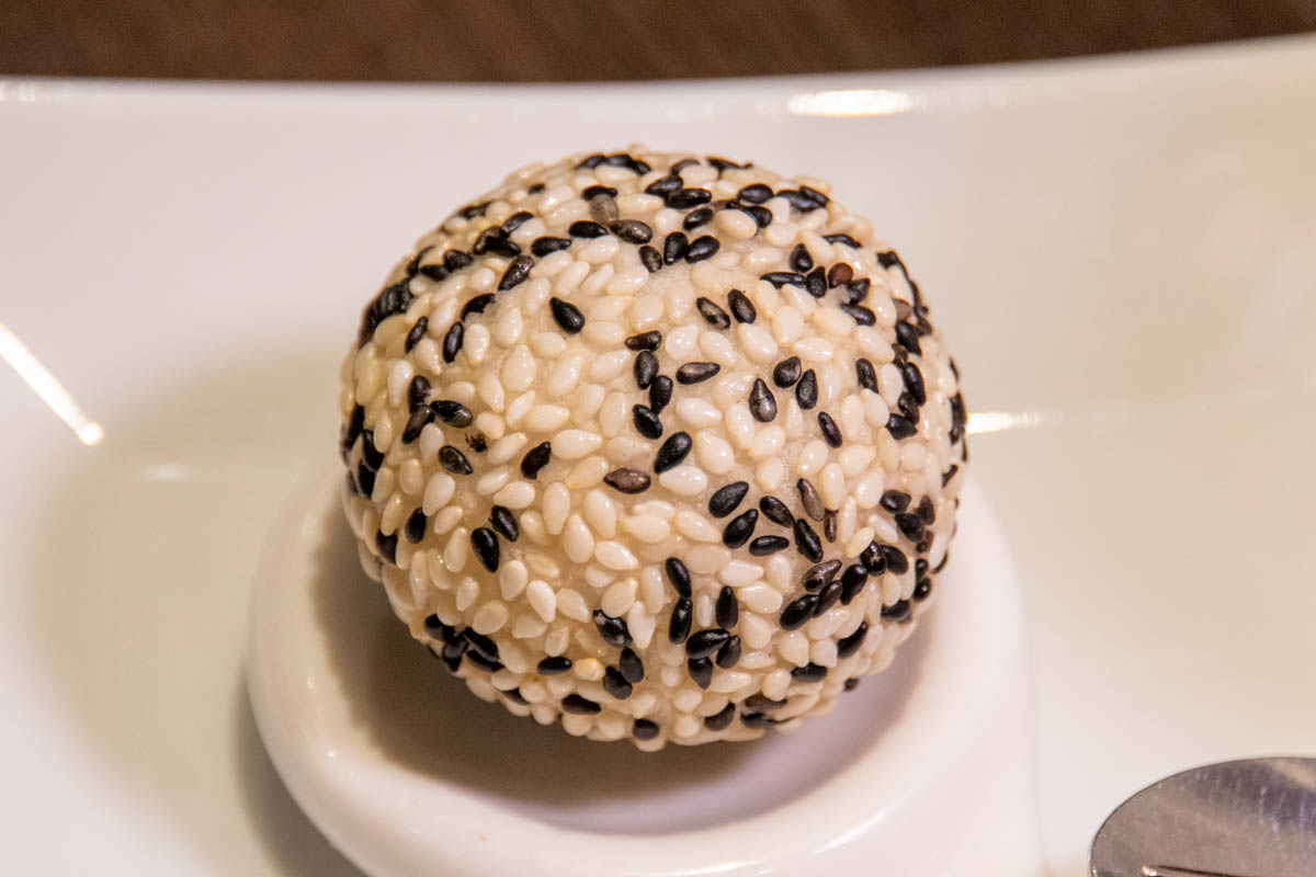 胡麻団子は、ひと口かじると外側のもちっとした生地の中には、黒い胡麻餡が!