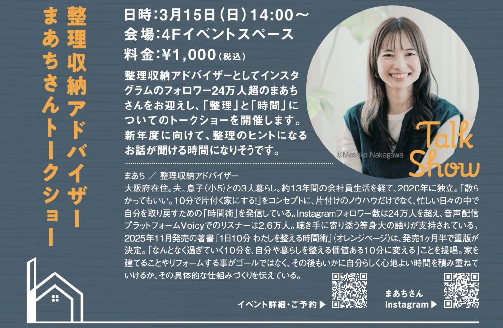 整理収納アドバイザーまあちさんをお迎えして、「整理」と「時間」についてのトークショーを開催します。