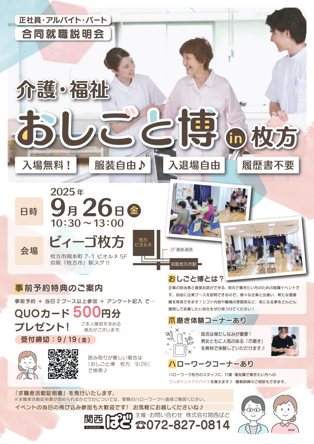採用担当者さんと気軽にお話ができる、介護・福祉業界に特化した就職イベントを枚方市で開催します。