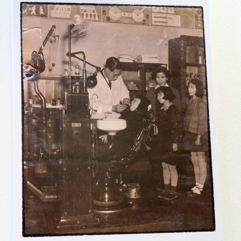 カウンター奥に飾られているのは、歯科医師だった鶴崎先生のお父さまが大阪市内の小学校で検診されていた時のお写真。