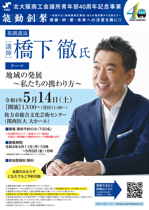 北大阪商工会議所青年部創立40周年の記念行事が行われるようで、元大阪市長でもある橋下徹さんは「地域の発展」をテーマに講演されます。