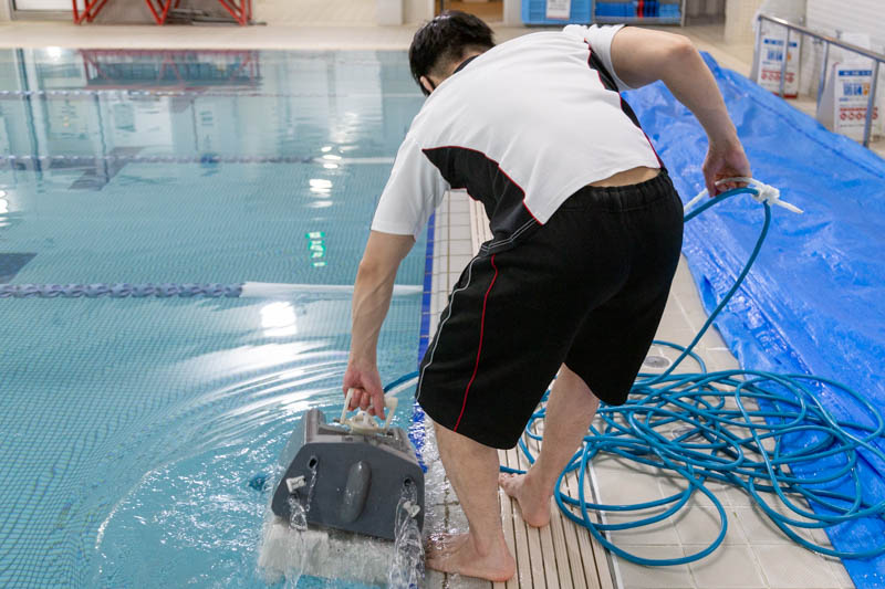 閉館時にプール用の掃除機を入れて、一晩かけてプール内の髪の毛やゴミなどを吸い取ってキレイにします\(^o^)/