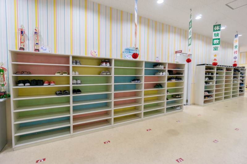 観覧席の向かい側に靴箱があります。カラフルで可愛い(^^)