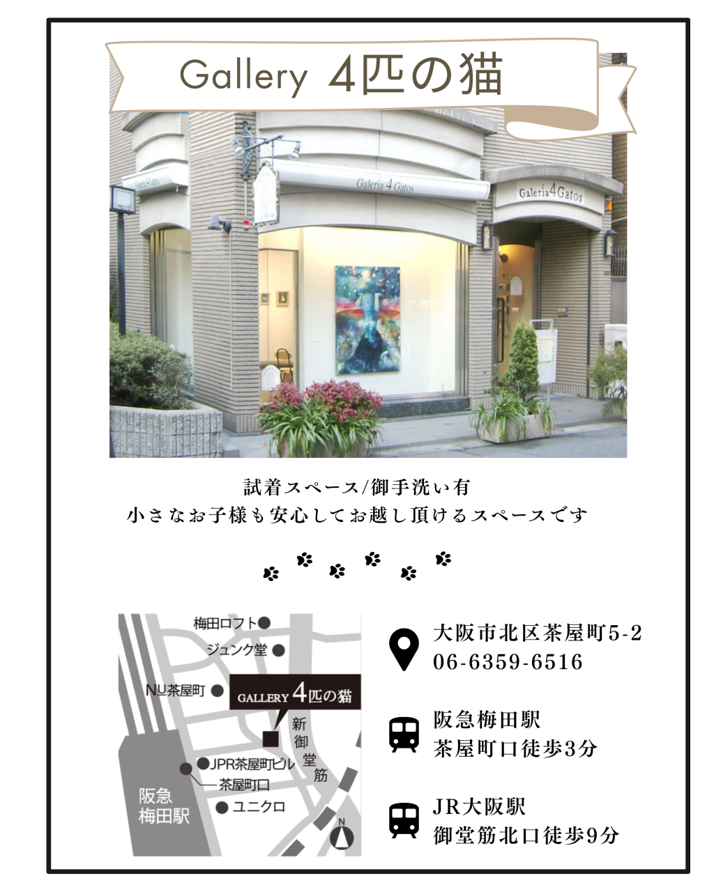 今回のイベントは6月27日〜7月1日に大阪梅田茶屋町の「ギャラリー4匹の猫」で行います。時間は11:00-19:00(土日は11:00-18:00、最終日は11:00-17:00)。