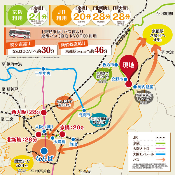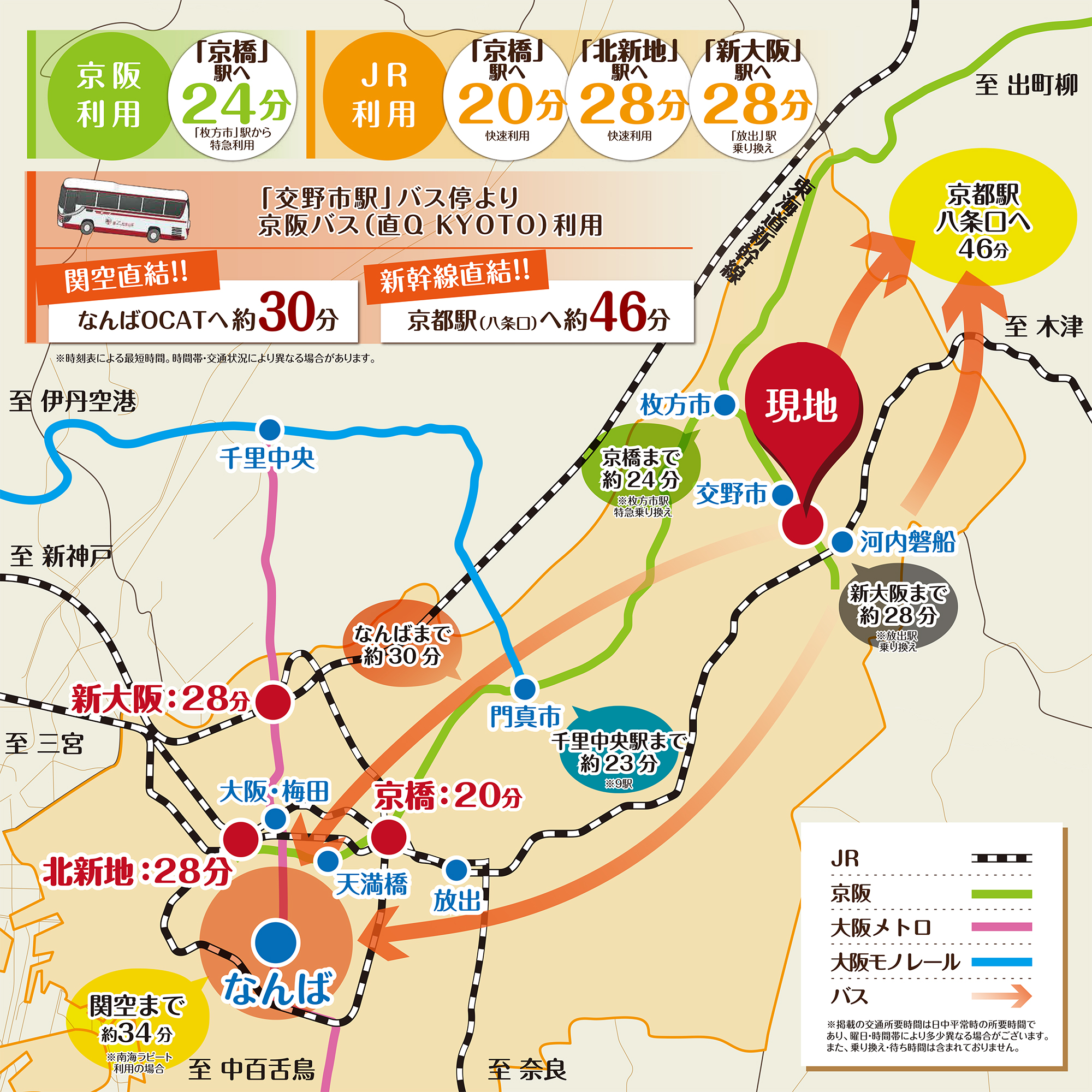交野市駅から難波・京都への直行バス『直Q KYOTO』という特急バスが1日に37本出ているので、第二京阪を通って京都や難波へのアクセスもしやすいです。