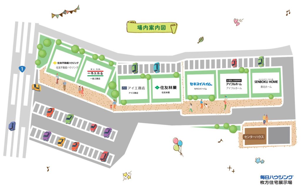 会場は国道1号線沿い「池之宮」交差点の近くにある毎日ハウジング枚方住宅展示場!