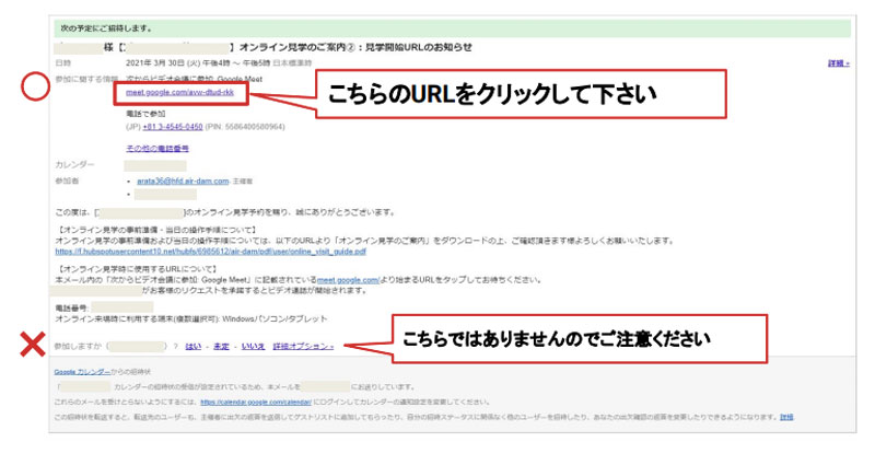 オンライン見学のご案内2というメールの中にある、meet.googleから始まるURLをクリックしたら…スタートです!