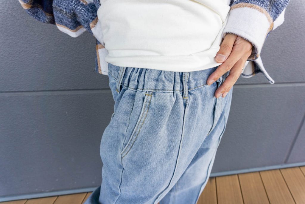 しかも、ジーンズはウエストゴムでめっちゃラクやし、チェックシャツも羽織るだけで今っぽくなれてええ感じ♪