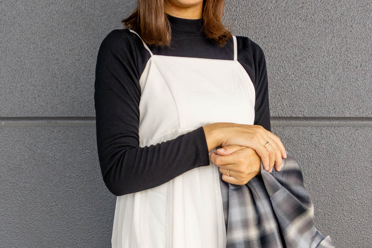 キャミワンピは胸元切り替えでチュールが重なったデザイン。脚長効果&上着を脱いでもかわいい!