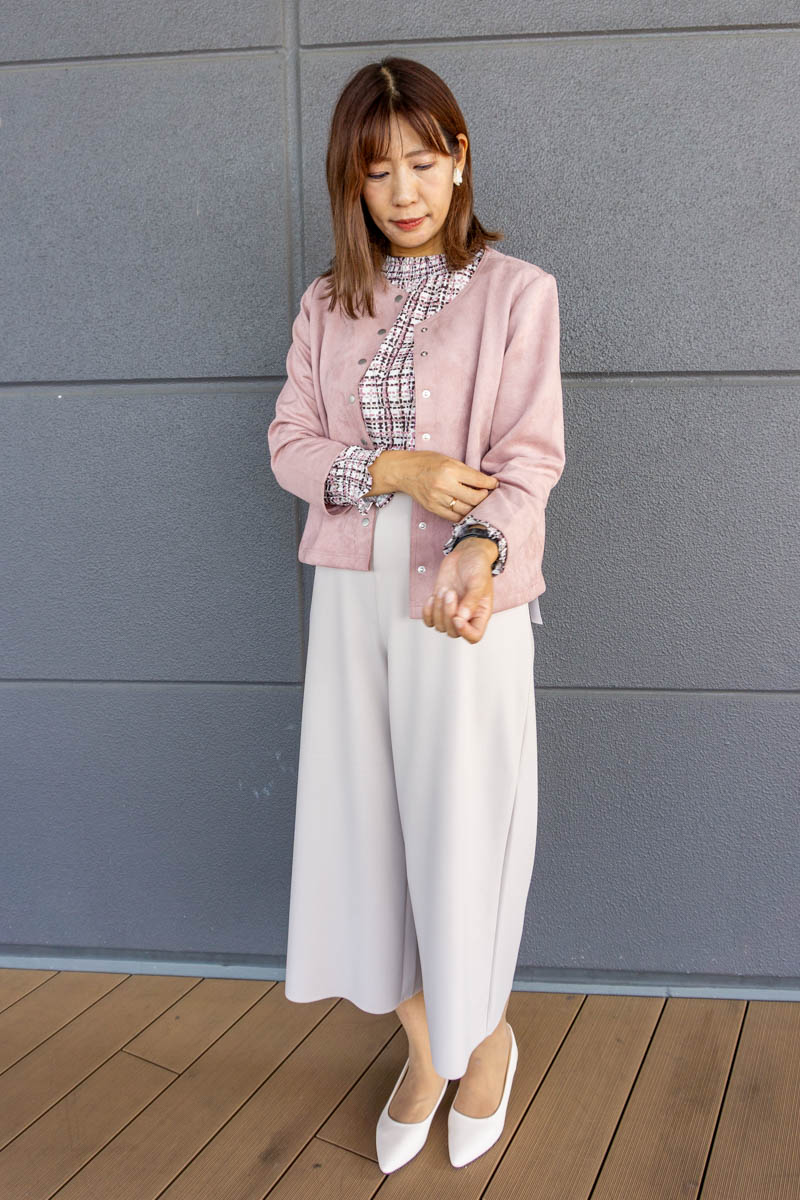 きちんとした印象に見えますが実はストレッチ素材で動きやすいので、秋のお出かけにぴったりです♪