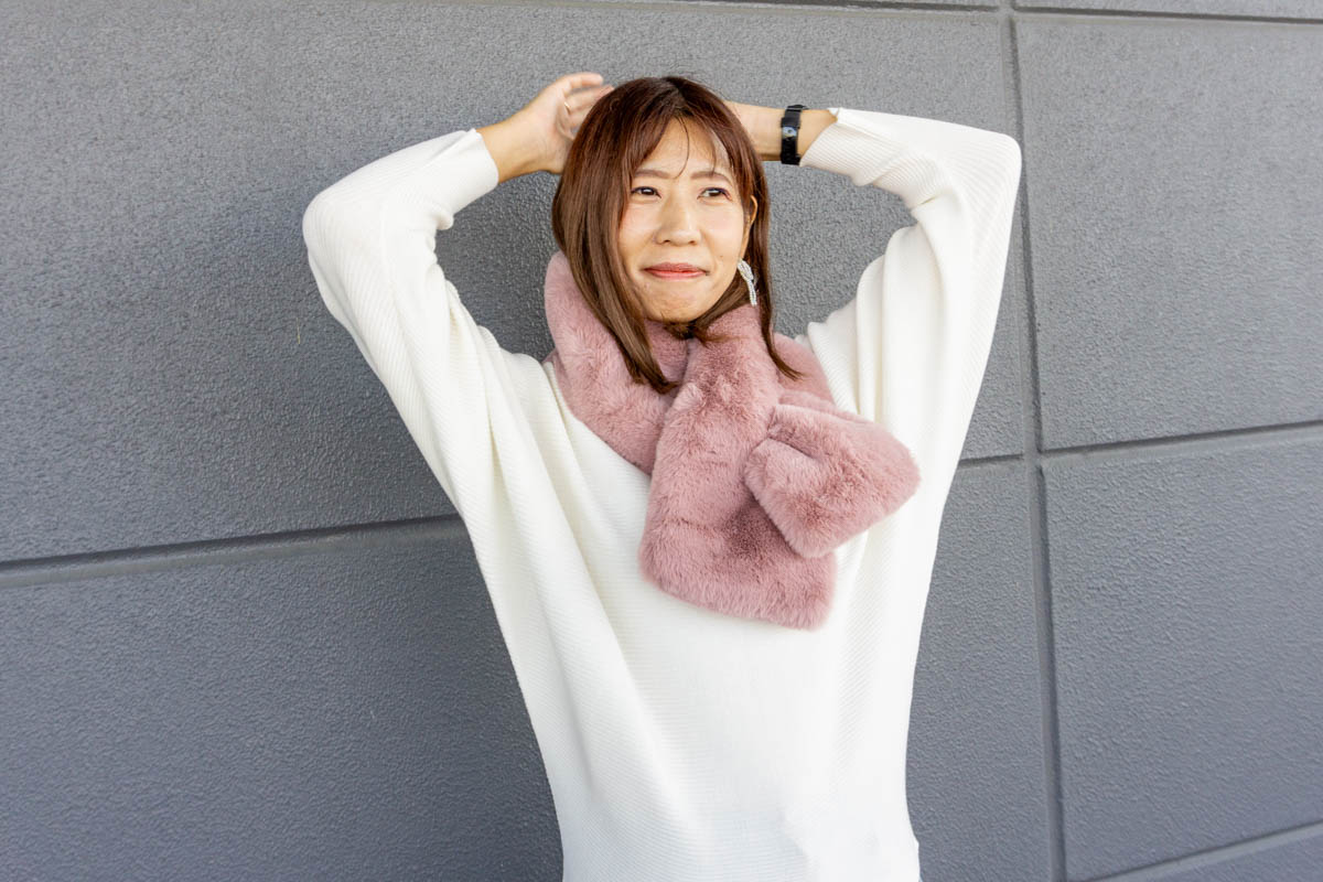 マフラーは巻き方とかちょっとテクニックがいるけど、このティペットは穴にふわっと通すだけでかわいいシルエットになるから便利やわ〜♪