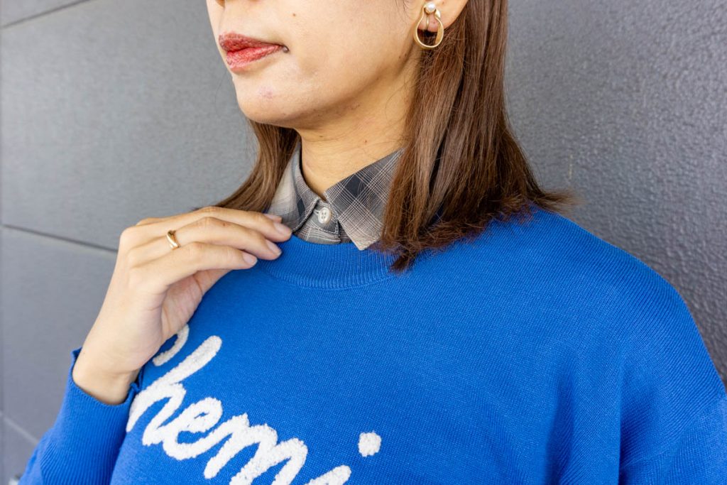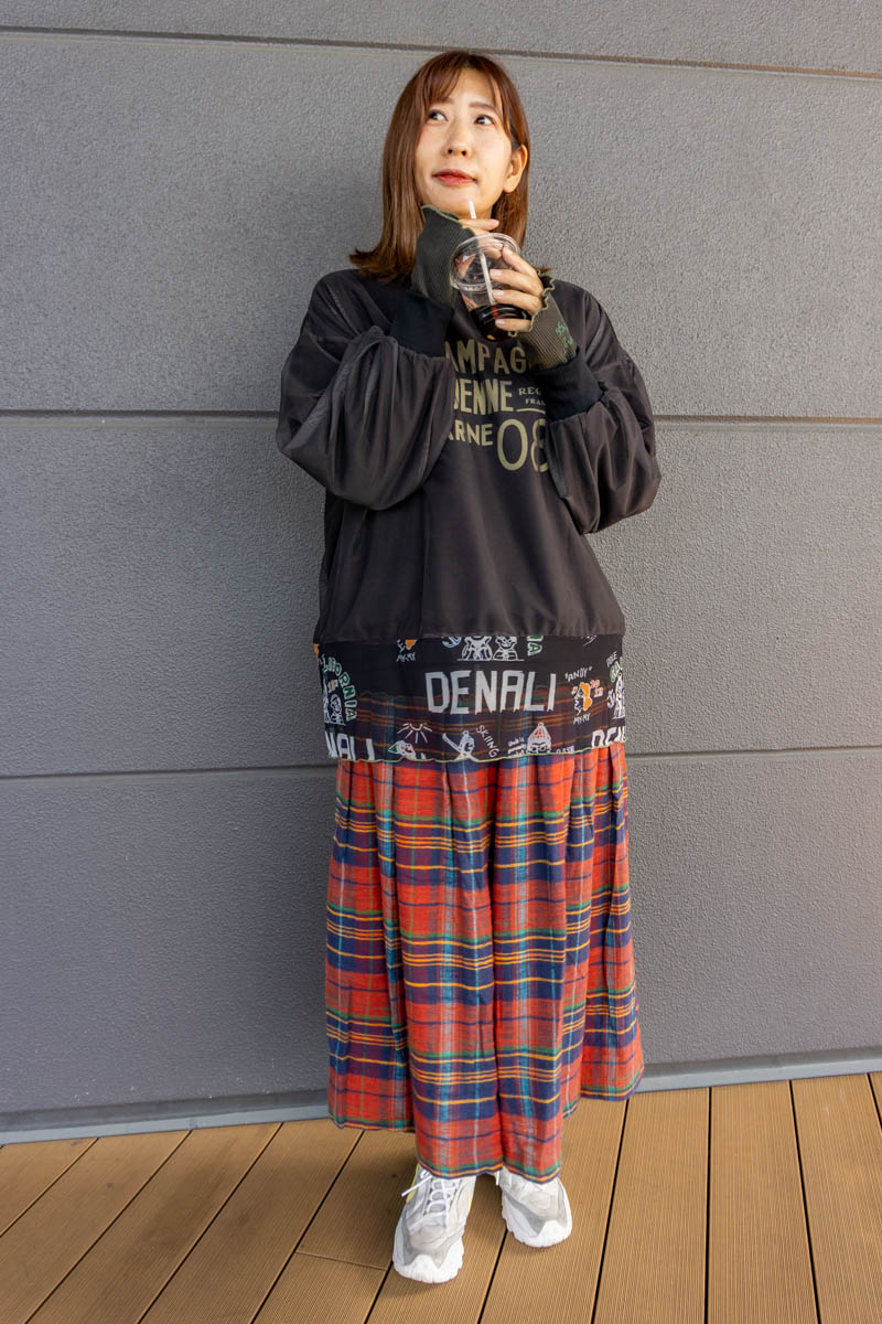ロゴ入りのニットから見えるチェックが秋っぽい♪
