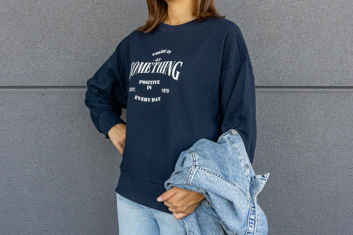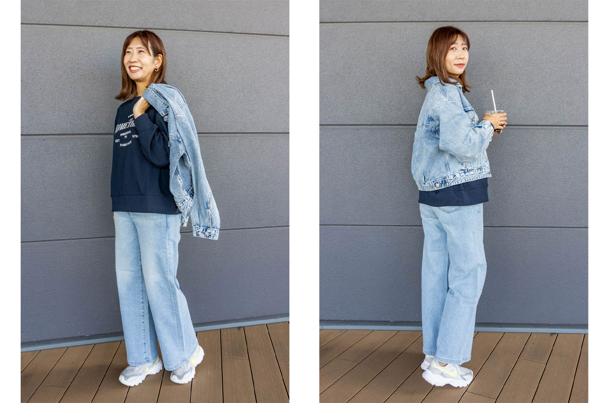 薄い色のデニム×スウェットで濃い差し色っておしゃれ〜♪