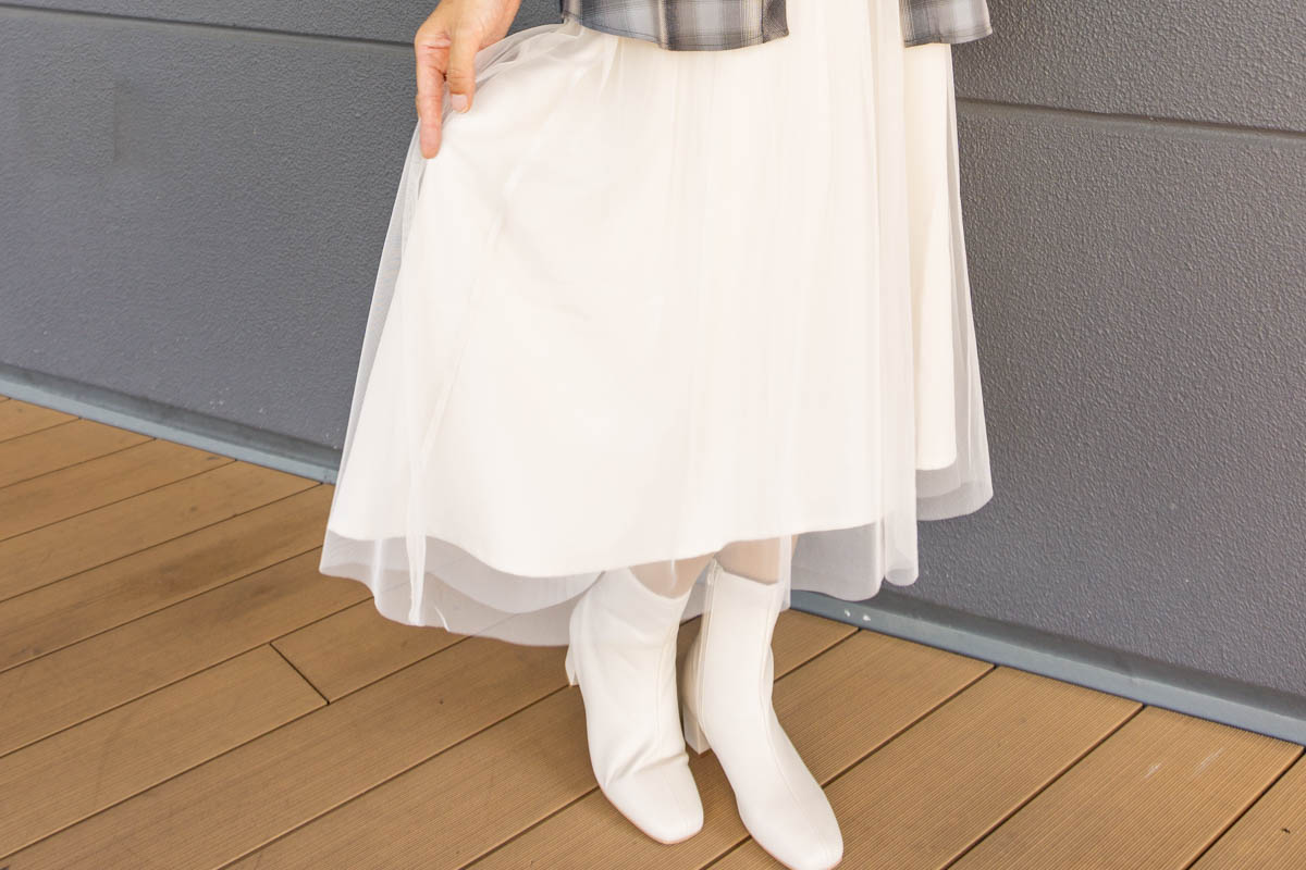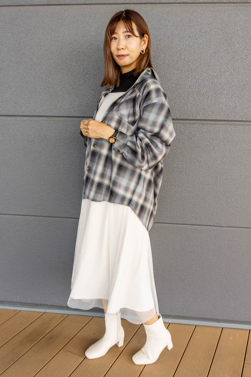真っ白なチュールのキャミワンピ&真っ白なブーツで女性らしいコーデに、カジュアルなチェックシャツでトレンド感をプラス!