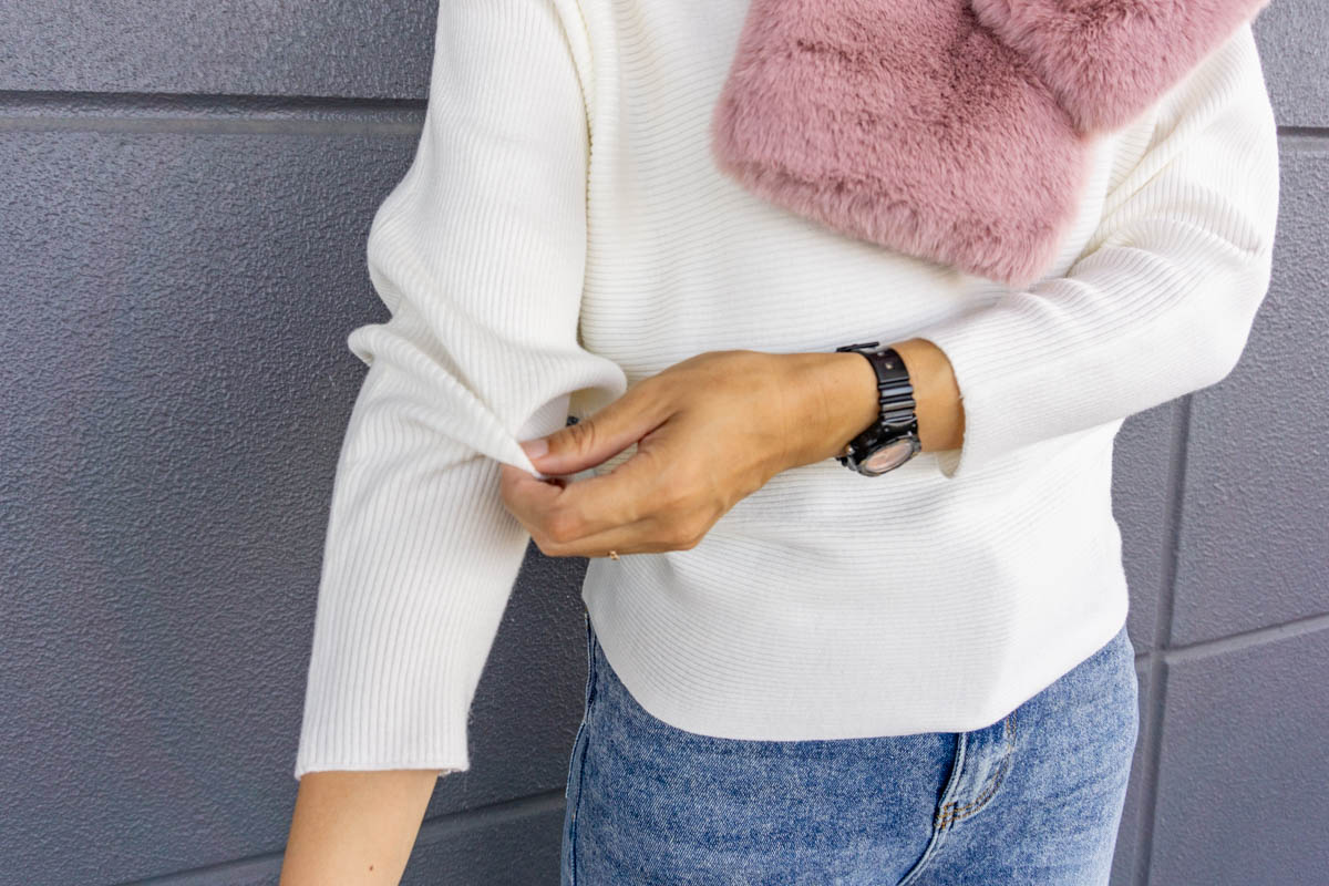 ナーガのコーデはサイドスリットのシャツ×短め丈のニットでバレルレッグの形をきれいに見せつつ、ヒップは適度に隠せて体型カバーもばっちり!
