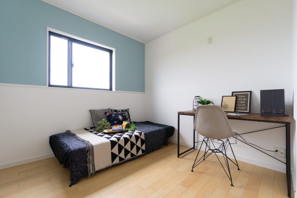 その隣の5帖の子ども部屋もライトブルーのカラー漆喰がデザインされていて、ウォールシェルフもあってお気に入りのおもちゃを飾ることもできます。