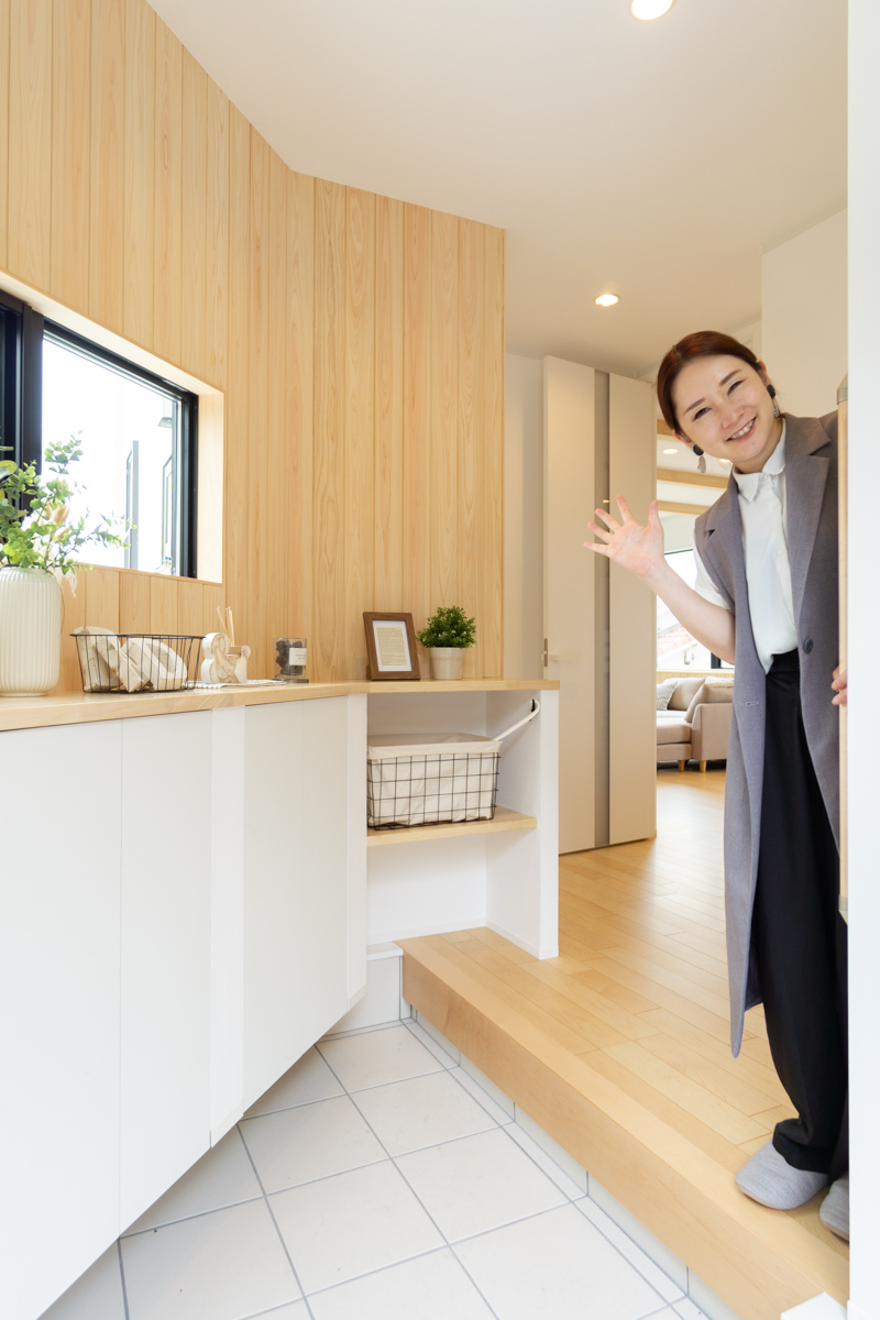玄関スペースはナチュラルな木張りが映える明るい空間。