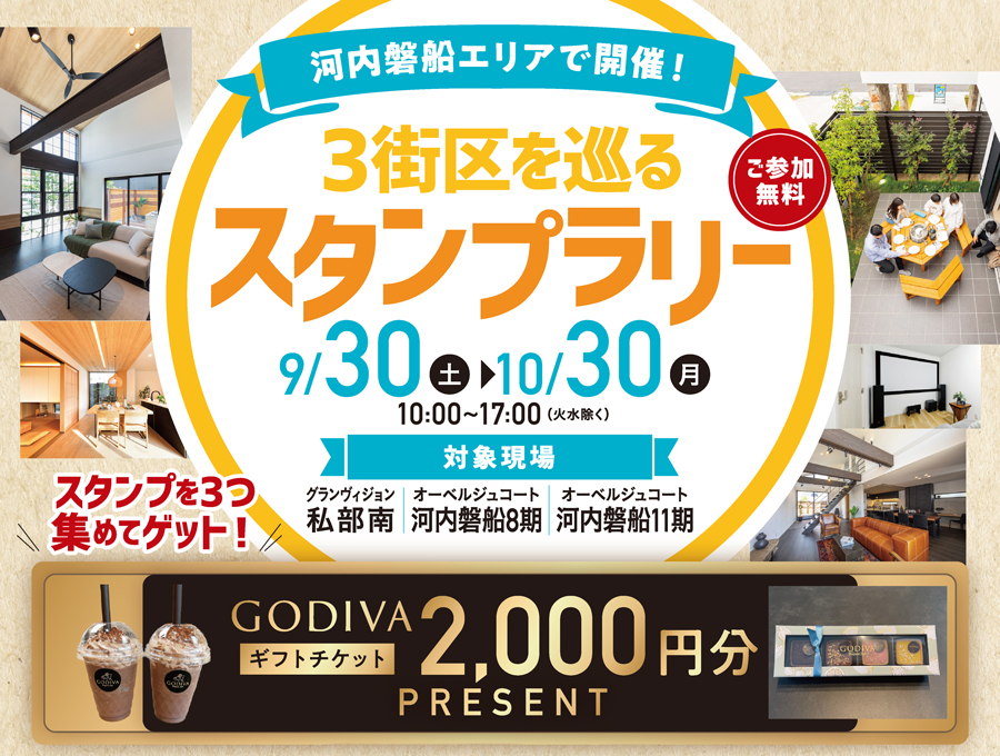 『オーベルジュコート河内磐船11期』のすぐとなりの『オーベルジュコート河内磐船8期』と、同じエリアにある『グランヴィジョン私部南』の3分譲地合同のイベントで、ご参加の方にはなんと『ゴディバカフェ』で使える2,000円分のギフトチケットをプレゼント!